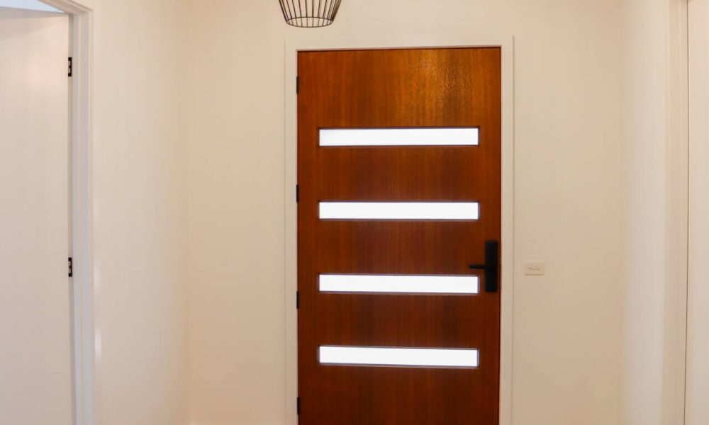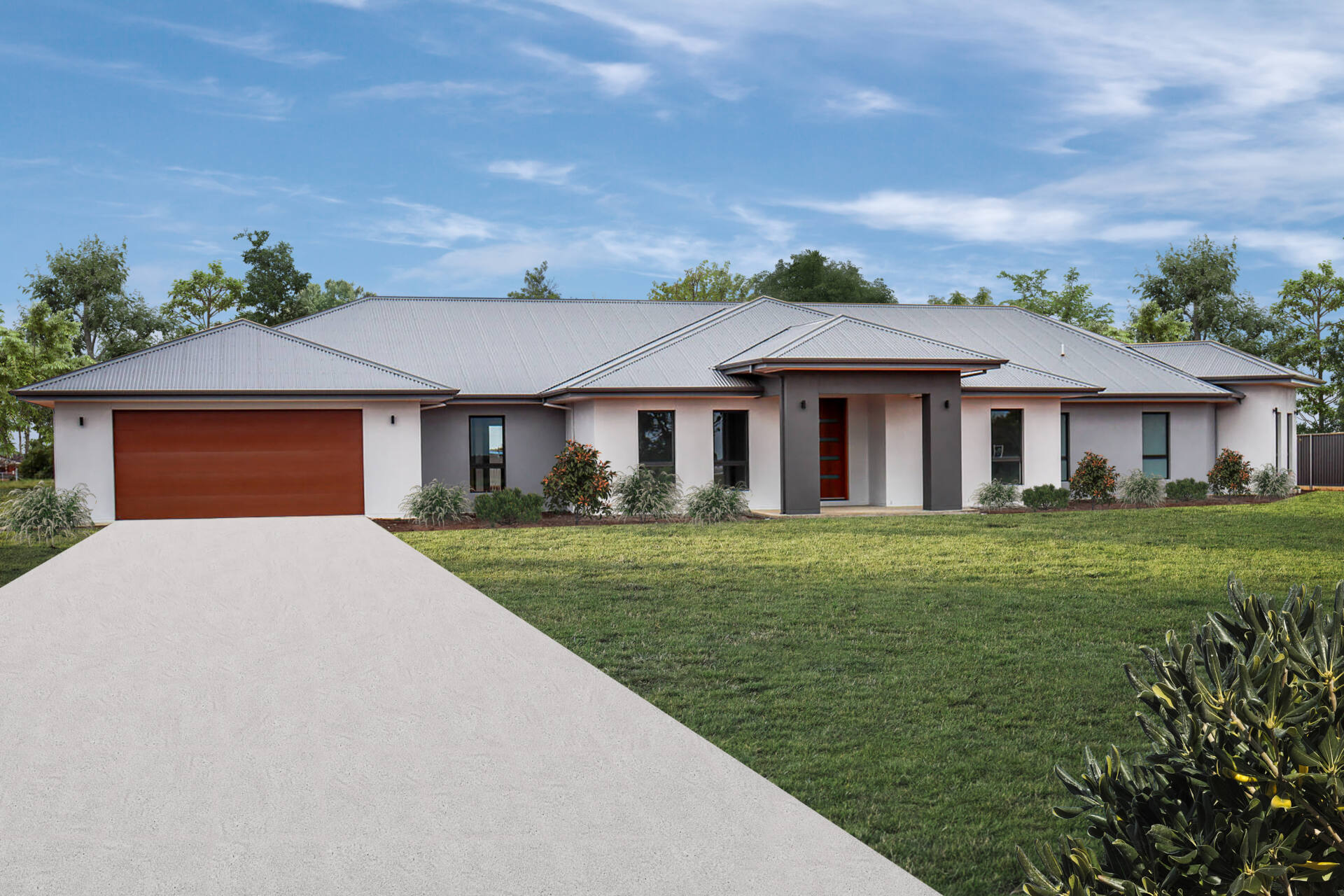 Our new residential home design in McEdwards Street, Birdwoodton is a stunning horizontal-style acreage home design. The exterior is big and bold, with a dark and clean roof and a white-painted exterior. The home entrance is highlighted visually by the dark central pillars that surround the large timber front entrance.